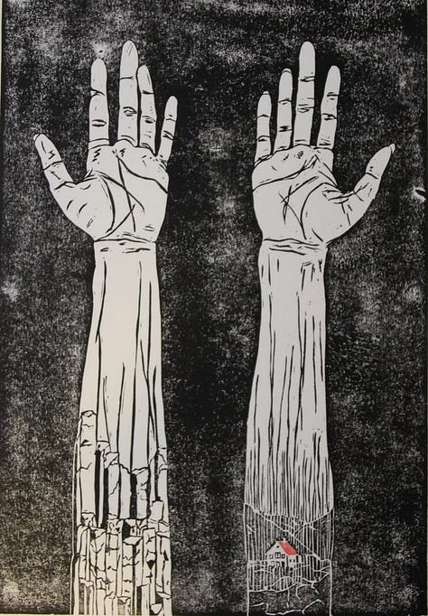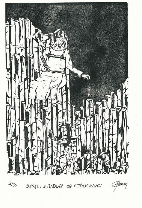 Besson, like Nocoń, engages deeply with the intersection of humanity and the natural world. Drawing on Iceland’s landscapes as her primary inspiration, her recent linocut pieces—Basaltstular og fjölkynngi and HEIMA—use the island’s ubiquitous basalt formations as visual and conceptual material to explore human embodiment, though to distinct ends. In Basaltstular og fjölkynngi, an elderly woman sits spinning wool. Her form is continuous with the basalt columns upon which she rests—simultaneously enthroned by and constituted of them. Yet the act she performs is not merely domestic. As the title suggests, she is practicing fjölkynngi (magic/sorcery). Like the mythological nornir who spin the fates of men, this basalt-woman engages in a magical act of weaving.