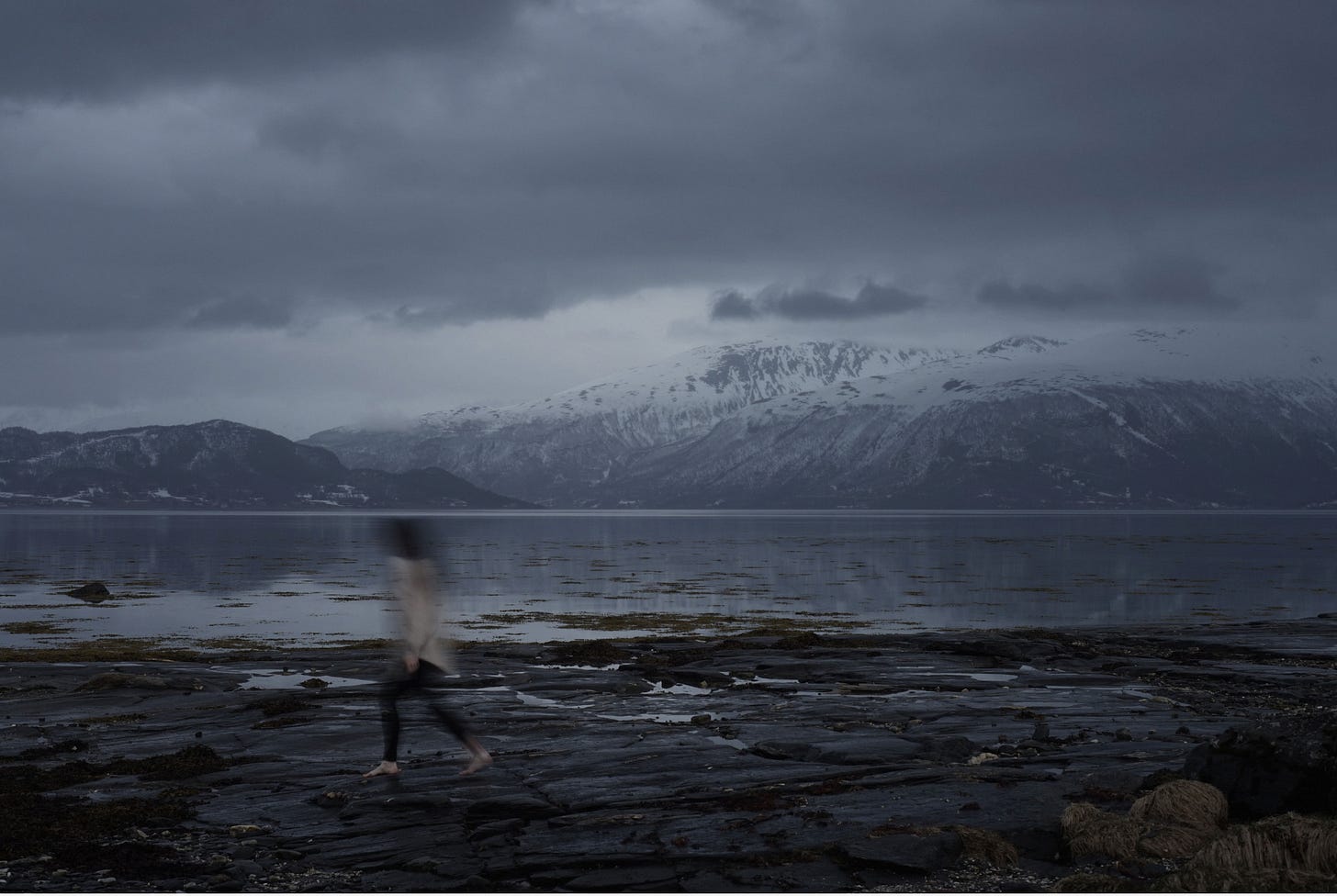 The imagery is clear: there is no ego amid this ancient landscape that has seen many such humans blur and fade as quickly as they emerged. As Nocoń herself tells us: “Something unfolds here that is at once ancient and fleeting: a moment suspended between presence and vanishing.” One senses that the blurred figure is merely one among a continuum of such figures passing along this shoreline. The impression is not that they are external to the landscape, but that the presence of nameless humanity is as central to its being as the titanous presence of the mountains. The blurring of the human subject (which generates a sense of motion) places the generalized human body within the conceptual framework of life itself. In Old Icelandic, að kvika (to move, to stir) and kvika (the quick, life, yeast) coalesce the ideas of motion and vitality. The subject is not merely vanishing—it is quickened.