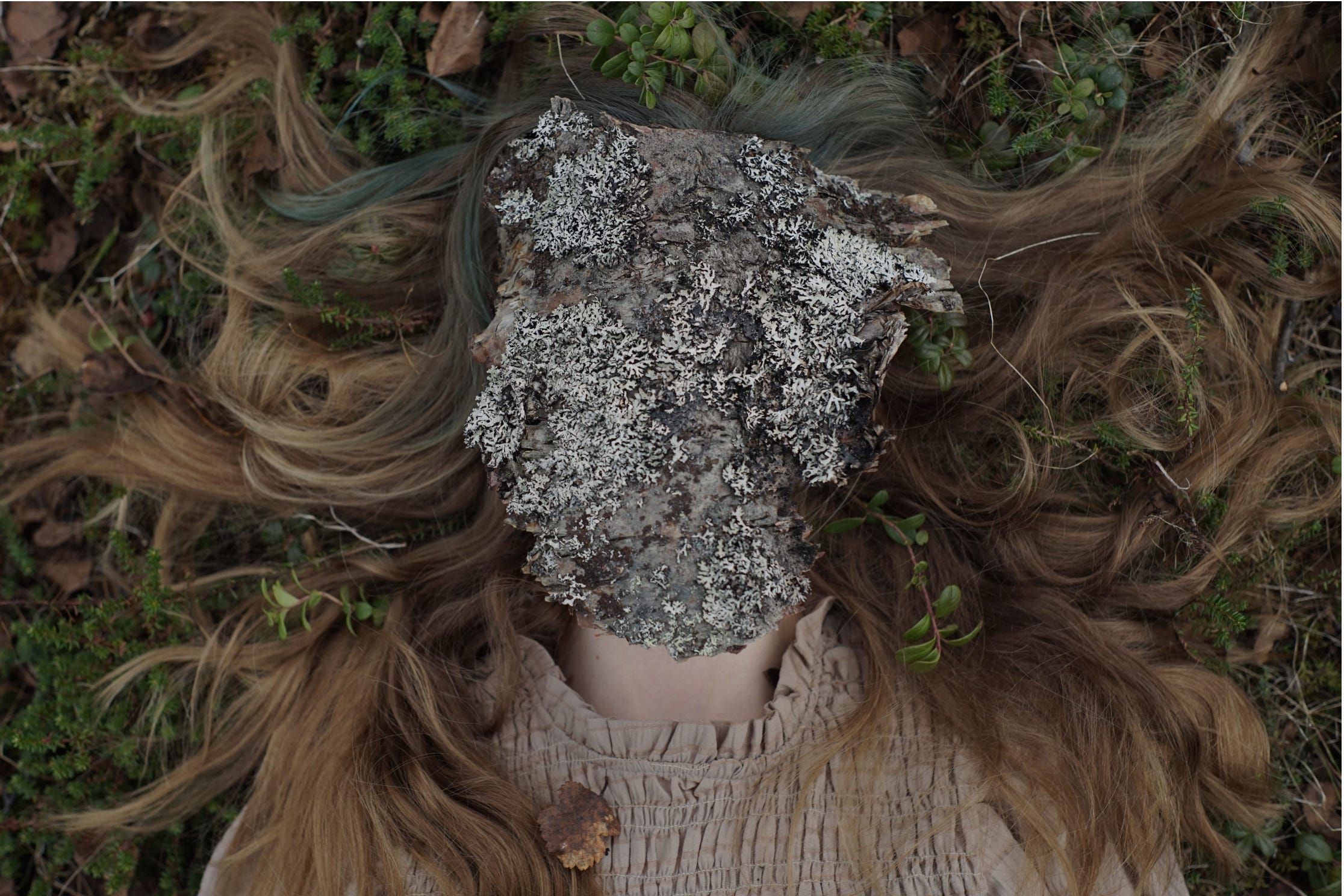 This is precisely the interconnectedness demonstrated in Nocoń’s untitled piece from her May series. Featuring a human model lying amid moss and leaves, the status of the human as subject (agential, centralized, gazing) is challenged through the intentional obscuring of the model’s face. Stripped of personal identity, her facial features are replaced with a strategically-sized strip of lichen-covered bark. The human, in this instance, has become the vehicle through which the identity of nature is presented to the viewer. Yet the human is not fully dissolved: the model has not been entirely relegated to the status of object (passive, decentralized, gazed upon). Not fully sublimated, yet not entirely focused, the human body works in tandem with natural features to create a composite entity as unique in its identity as a human countenance—or the face of a mountain.